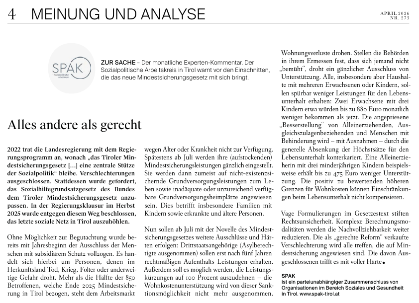 Gemeinsame Presseaussendung des Bündnis gegen Armut und Wohnungsnot, des SPAK Tirol sowie des TIF zur Verschlechterung der Tiroler Mindestsicherung